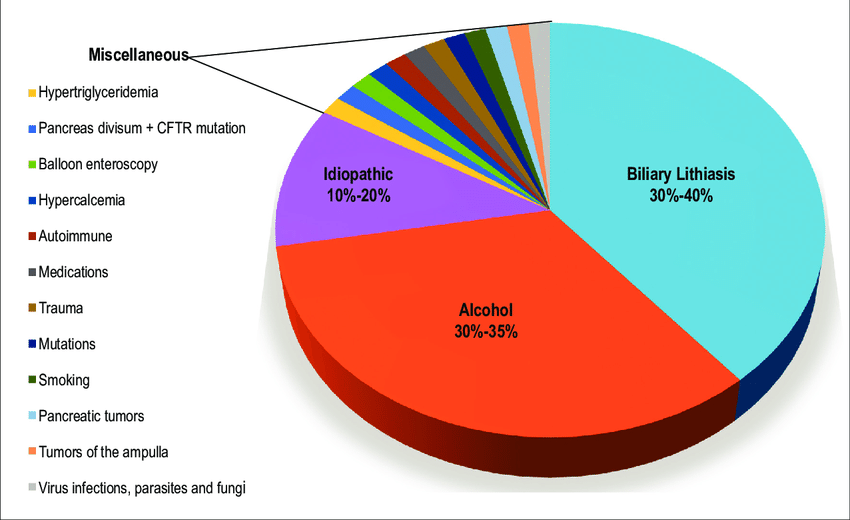 The most common cause of chronic pancreatitis is long-term alcohol abuse – it is thought to account for between 70 to 80 percent of all cases. Other causes include hereditary (PRSS1, SPINK1, CFTR, CTRC, CASR genetic variations), autoimmune, anatomic (pancreas divisum), obstructive, hyperlipidemia and idiopathic.